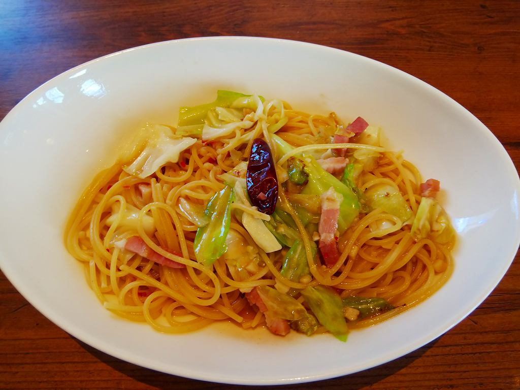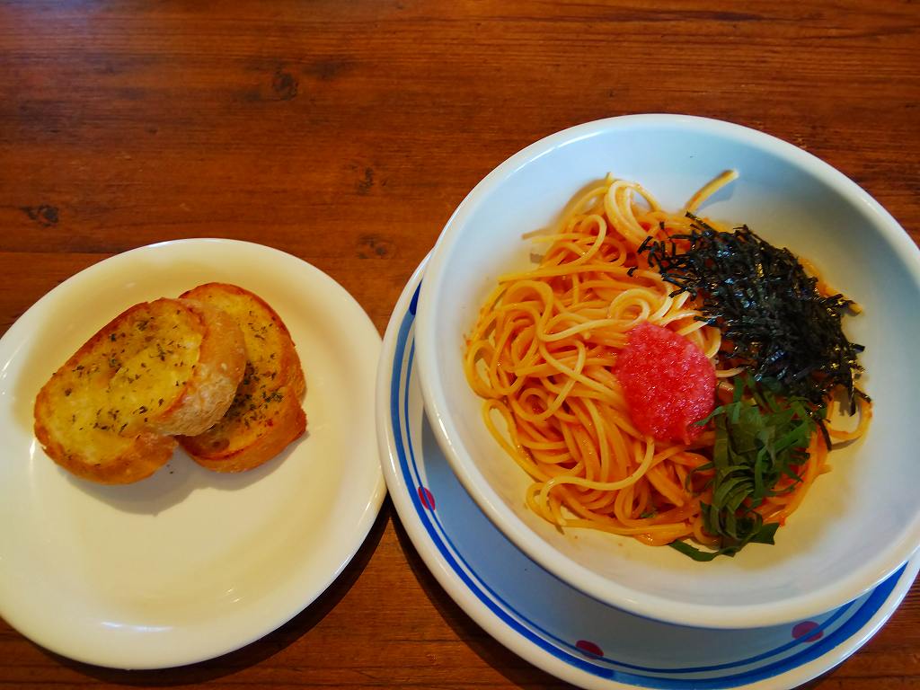 私は大好物の「たらこスパゲティー」+ガーリックトースト+ドリンクバーのセットで、うちの奥さんは「アンチョビキャベツのペペロンチーノ」+コーンポタージュ+ドリンクバーのセットを頂きました。