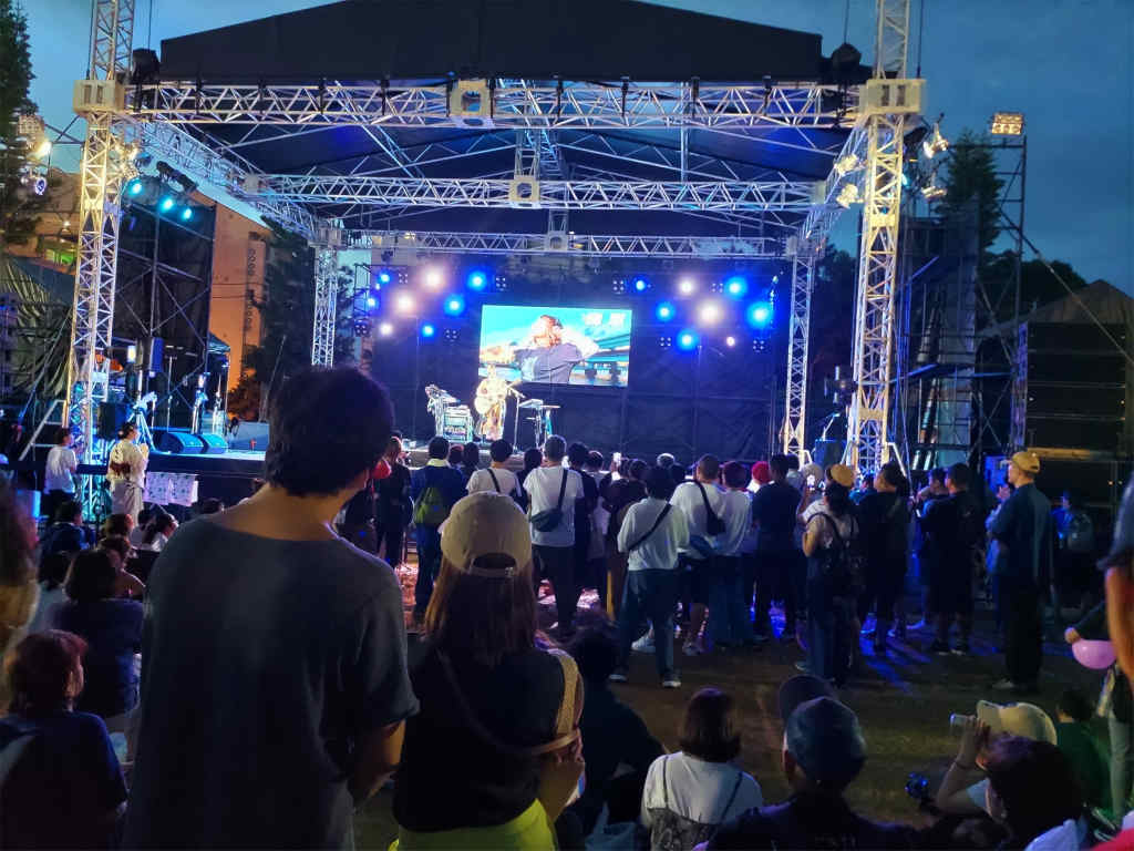 飲み始めてすぐに、フェス出演の歌手の女性の音楽が始まり、ステージのすぐ前ともあって、大音量の音楽が巨大スピーカーから流れ出しました。