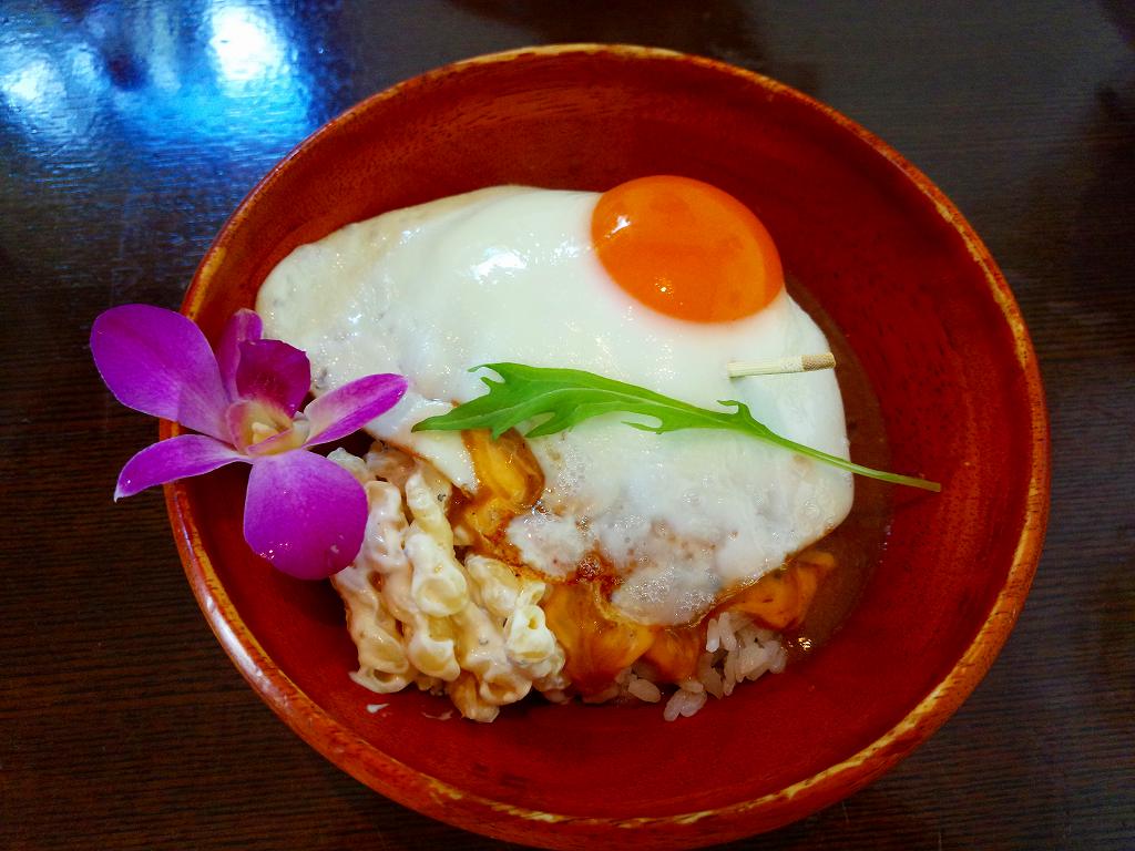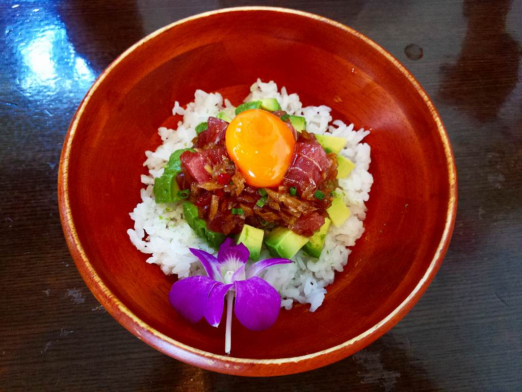 メイン料理には、私はハワイアンで定番の「チーズロコモコ」で、うちの奥さんはマグロとアボカドを ごはんにのせた「アヒポキ丼」を注文しました。