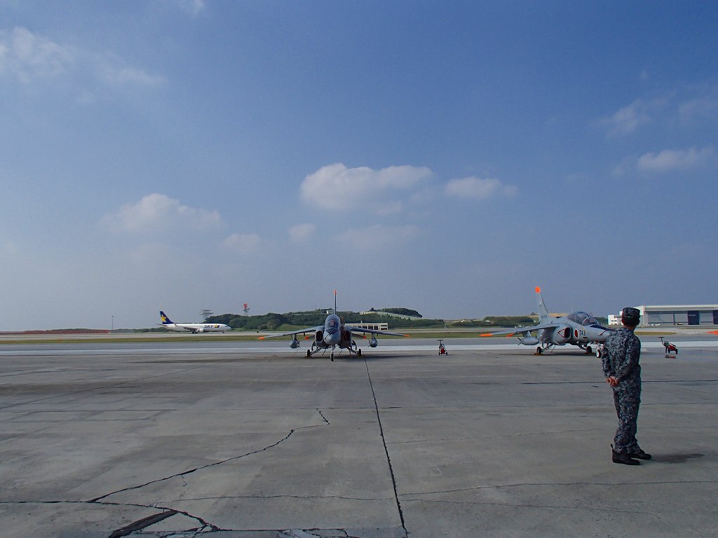 午前中に基地に到着し、軍用機が並んでいる「那覇空港滑走路」の横をぐるっと一周しました。