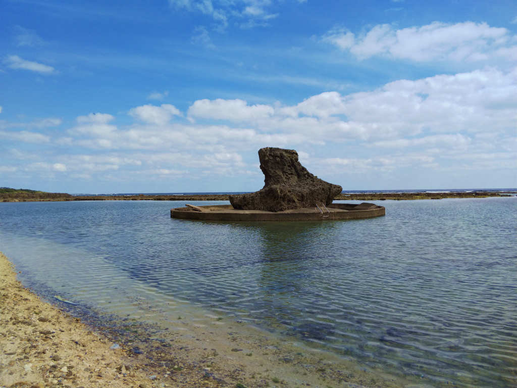 この仕切られたプールのすぐ横の海岸内にも、元々あった岩の廻りをコンクリートで整地した島も有り、この島には手すりが付けてあるので、上に登る事も出来るようになってました。