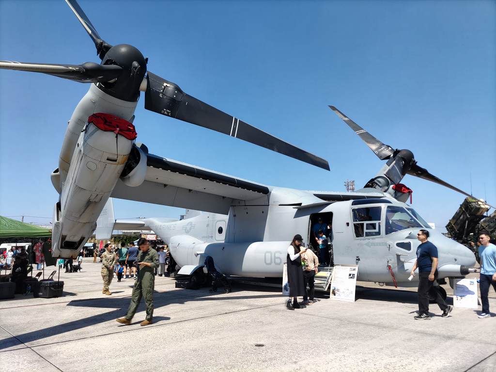 色々な飛行機に乗る行列が点在してたんですが、ふと横に展示しているオスプレイを見ると、行列がだいぶ短かったので、並んで中に入る事にしました。
