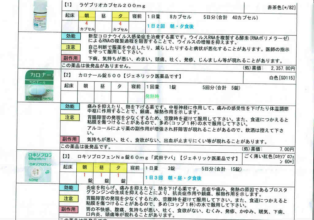先生の話では、高額になる薬の支払い分は国が補助するとの話だったんですが、もらった処方箋の紙を見ると、1錠2,300円以上のカプセルを1回当り4錠、1日2回ずつ5日間飲むとの指示だったんですが、ざっと計算しても5日分で10万円近くしてました。