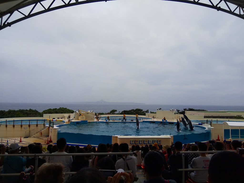 その後「美ら海水族館」へ向かい、無料の「沖ちゃんショー」でイルカのショーを見て来ました。