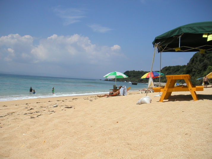 伊計島の伊計ビーチを過ぎて畑の中の標識を見ながら、「まだ先に行くの」と思う位に進むと出て来る大泊ビーチです。さすがに伊計島まで行くと海はかなり綺麗です。おまけに混んで無いので、ゆったりと過ごせます。砂もさらさらで気持ち良かったし!
