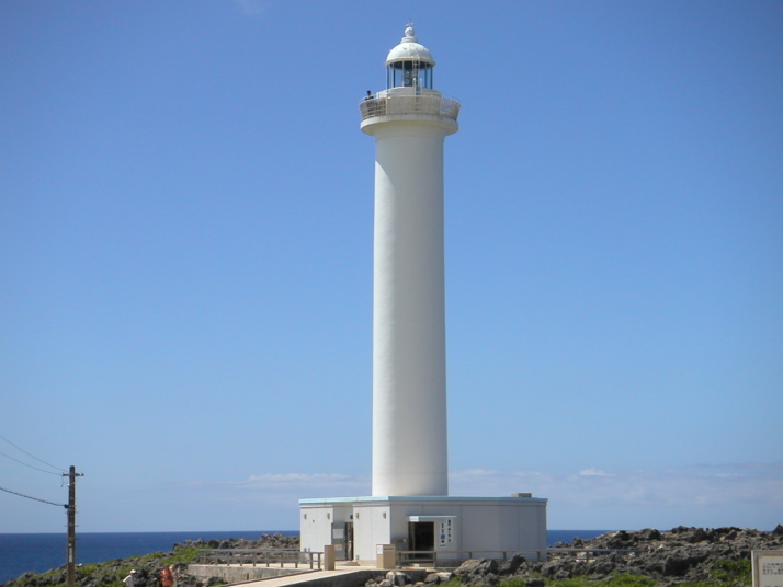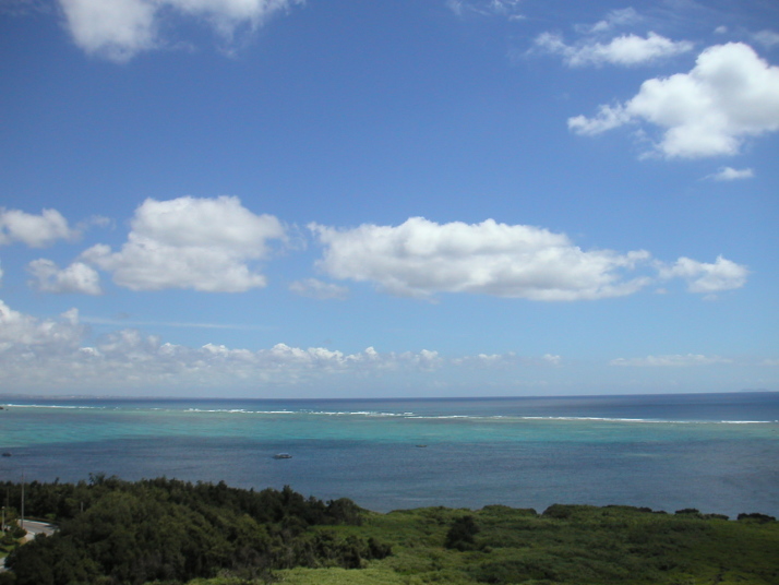 本島中部辺りにある残波岬です。ここ良いですよ〜!眺めが!でも暑いんですけどね。岬の先端に灯台が有るんですけど、この上からの眺めが最高です。ちなみに入場料が大人150円、子供20円かかります。(なんで、子供は20円なの?)この日は麦藁帽子をかぶって昇った為、飛ばないように帽子を押さえながら、写真を撮りました。下を観ると結構怖いかも! |
