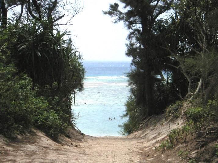 車を停めて、海岸方向へ歩き出すと透明度の高い海が見えて来ました。沖縄では珍しく砂浜が白い砂地でした。(もしかすると人口の砂かも知れませんけど?)