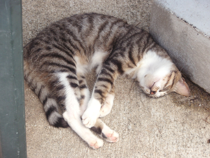 宿の周りには、無数の猫が居て、この猫は、昨日の夜、私達が誘われて飲んでいた、宿前のビーチパラソルの下で、気持ち良さそうに寝ていました。