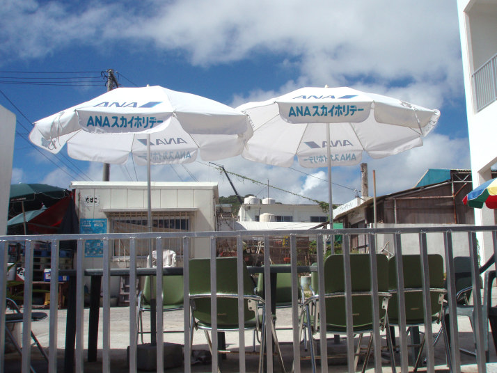 宿に入ろうとした時、玄関前の写真のパラソルの下で、宿のおじさん夫婦+数人が飲んでいて、私達も呼び止められました。