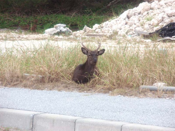 港へ向かう途中、港から数十mくらいの道路の脇に、野生のケラマ鹿が普通に座っていました。