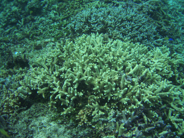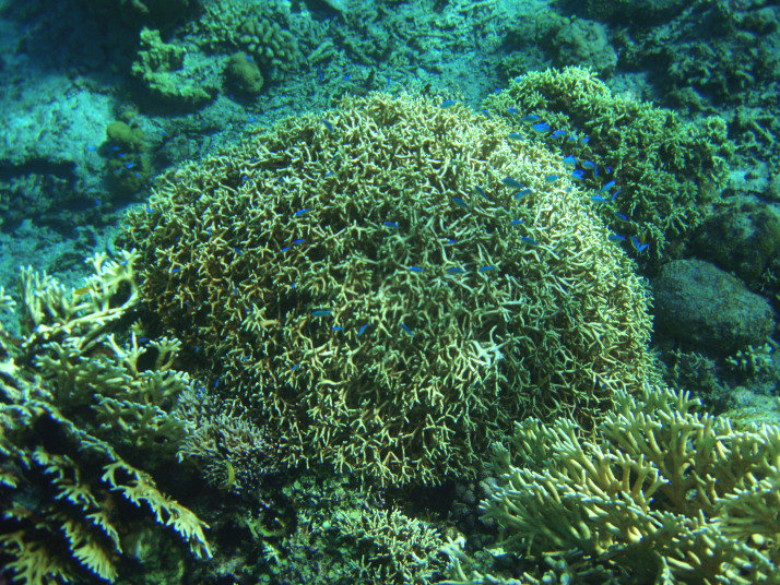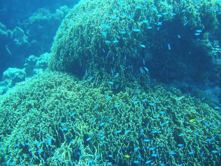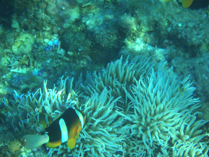 小さな魚達は珊瑚の中に隠れていて、外敵がいない時は花粉のような状態で珊瑚の周りを泳ぎ廻っているんですが、ちょっと大き目の魚が近づいて来ると、さっと一瞬で珊瑚の中に隠れていました。