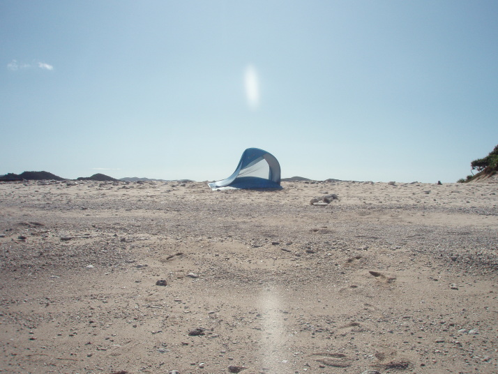 でも、持参したテントをいつものように立てて見ると、ご覧の状態で、横からの風で、なかなか大変でした。