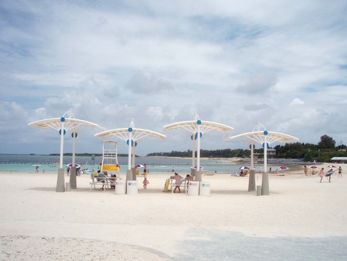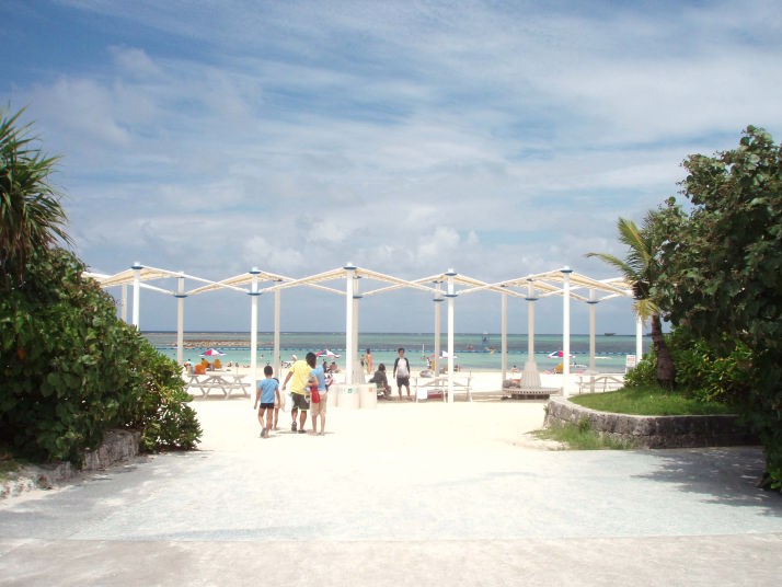実用性はあまり無いような気がしましたが、白い屋根付きのあずま家が砂浜とマッチしていました。