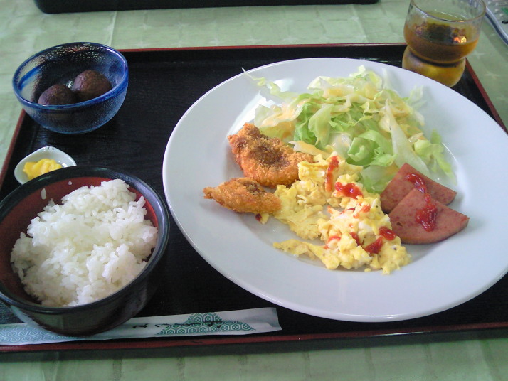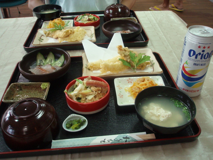 着いてしばらくすると、昼近くになったので昼食を食べに近所の食堂を廻って見ると、どの店もcloseで、開いている店も、お客さんの対応にてんてこ舞いのようだったので、集落唯一の店「新垣商店」で、お弁当を買って宿で食べました。
