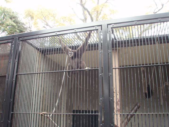 このおサルさん、めちゃくちゃ元気で、狭い檻の中でうんていをしまくっていました。