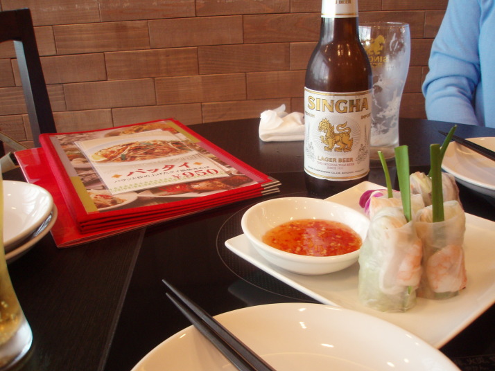 とにかく喉が渇いていたので、タイ料理の「コカレストラン」という店に入って、シンハビールと生春巻きを頼みました。