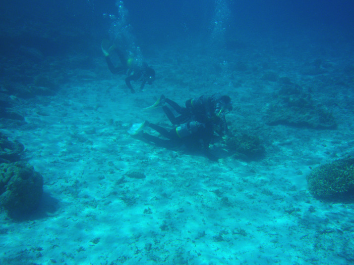 初心者の体験ダイビングだと思いますが、上から見ると動きの鈍い深海魚に見えてきます。