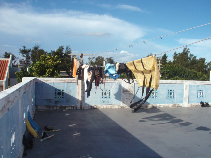 食後に屋上へ行って、干しておいた水着類を部屋へ持って帰りました。