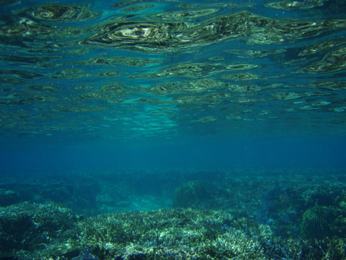 このビーチは不思議な形をしていて、満潮近くでも海岸手前の方で水深2m位の深さで、沖へ行く程浅くなり、最終的にはリーフのところで珊瑚が盛り上がって堤防のようになっていました。