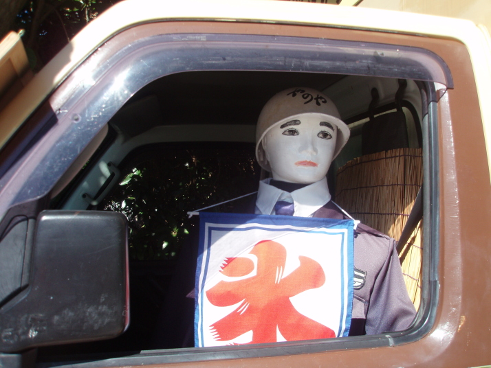 車の中に、有名な「宮古島まもる君」らしき人形が乗っていました。