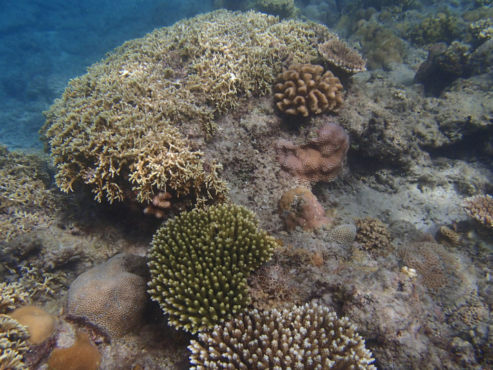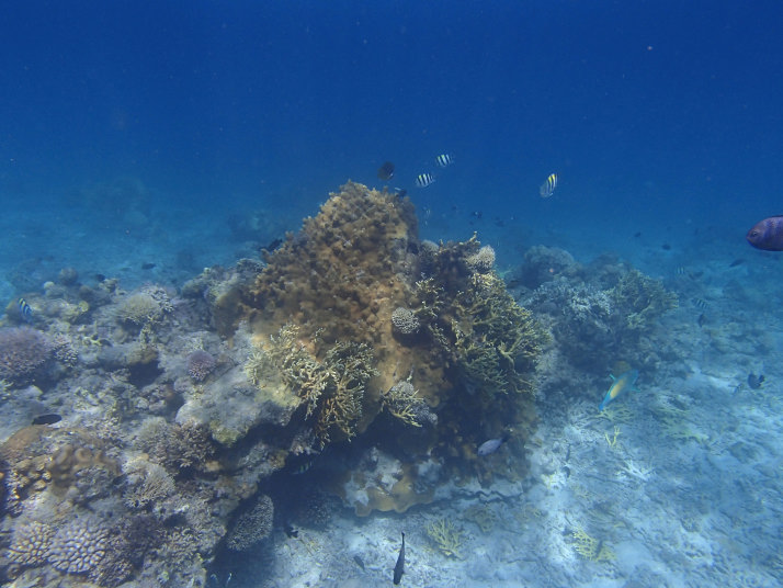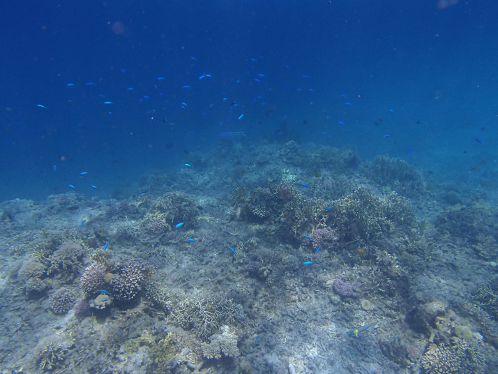 沖の方のダイビング船が泊まっている辺りまで泳ぐと、いつもながらの綺麗な魚達が見えました。