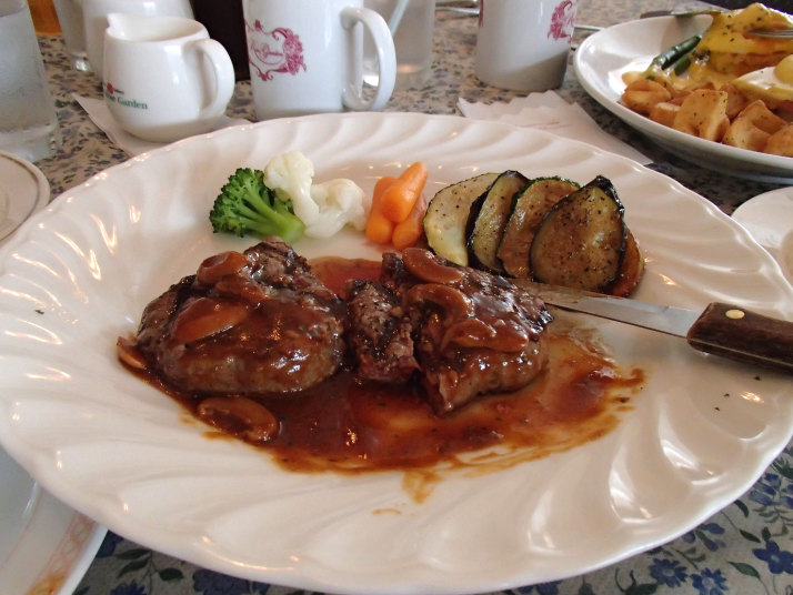 何を頼もうかとメニューを眺めていると、前に来た時も色々と説明してくれてた流ちょうな英語の発音のウェイトレスのオバー オススメが写真のスペシャルランチステーキでした。