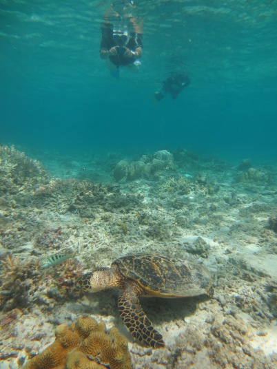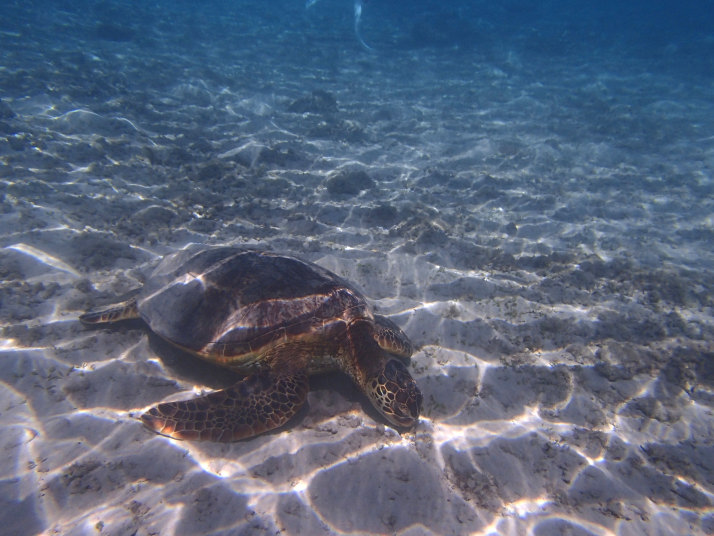 まず最初にガイドさんが「阿真ビーチの亀を見て行きましょう」と言うので、ちょっと泳いで見ると、すぐその辺りに亀が2匹もいました。