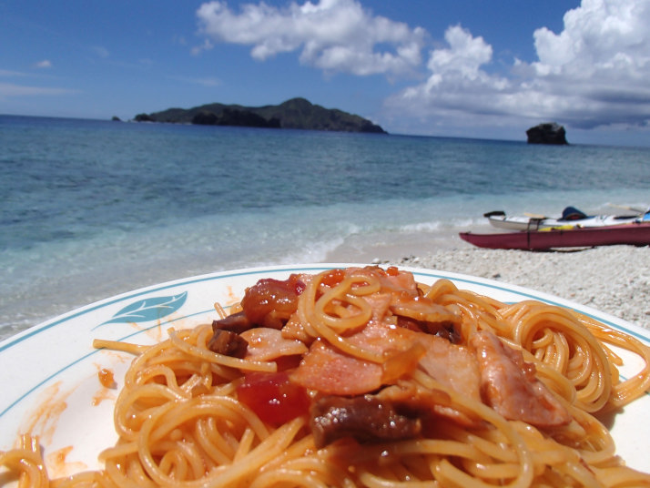 ランチは、まさかこんな無人島でスパゲッティを作ってもらってました。