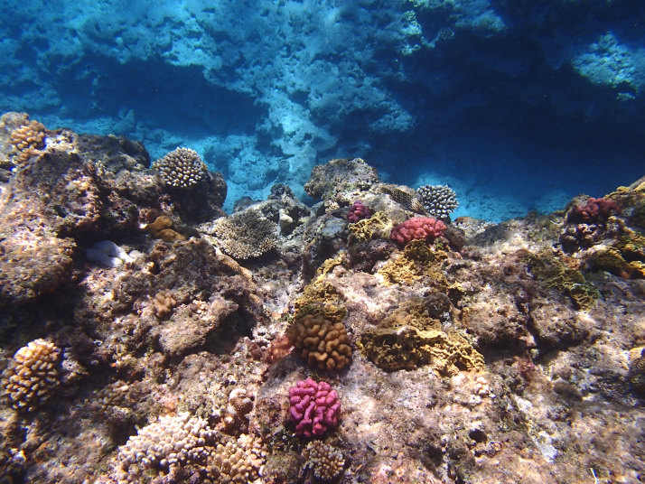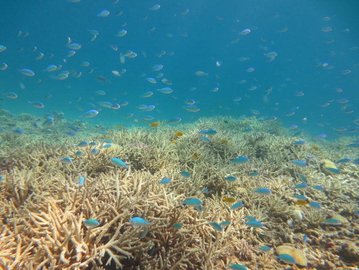 かなり遠浅が続いていたんですが、急に深くなった辺りから珊瑚が広がっていました。