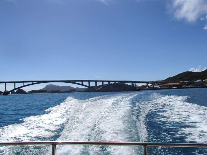 最後は安慶名敷島との間の中間くらいまで行って島へ戻って来たんですが、かなり水深も浅く、後で聞くと、干潮の時は安慶名敷島から歩いて渡れるくらいに浅いそうです。
