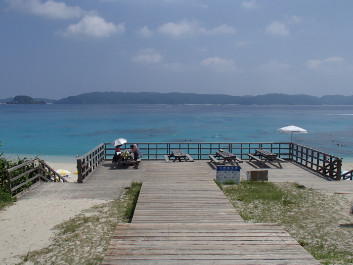 やっと、お父さんが帰って来たので、チェックインを済ませ着替えて、港まで行って送迎バスに乗ろうと思って歩いていたら、偶然通りかかった古座間味ビーチのレンタルショップのオーナー比嘉さんに「ビーチまで行くなら乗って行きますー?」と声をかけられたので、運よく乗っけてもらえました。