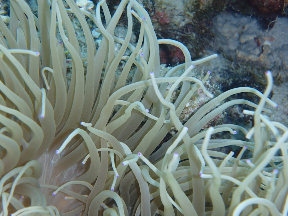 次のクマノミのいる場所で今度はちゃんと撮ってやると思い、潜ってじっくりとカメラを構えていると、親のクマノミが私に攻撃して来て、手の指を突っつかれました。