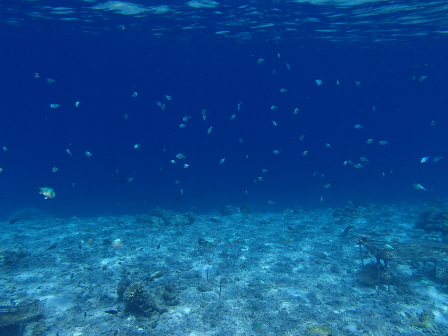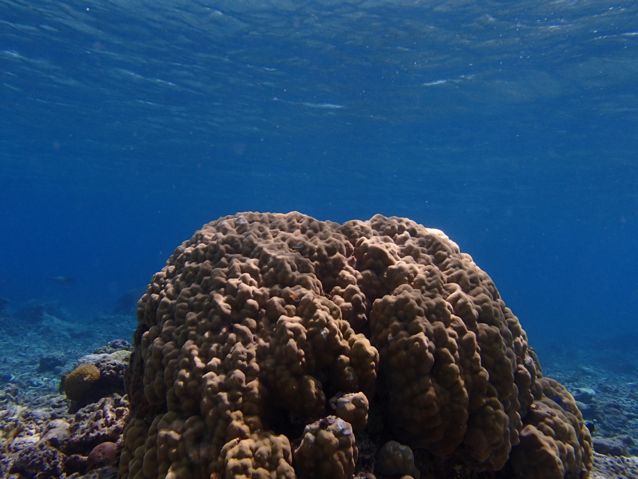 朝一だったので、これでも少し水深は浅かったんですが、結構深い場所に群生している為か、せっかくの珊瑚の色が暗いグリーンにしか見えませんでした。