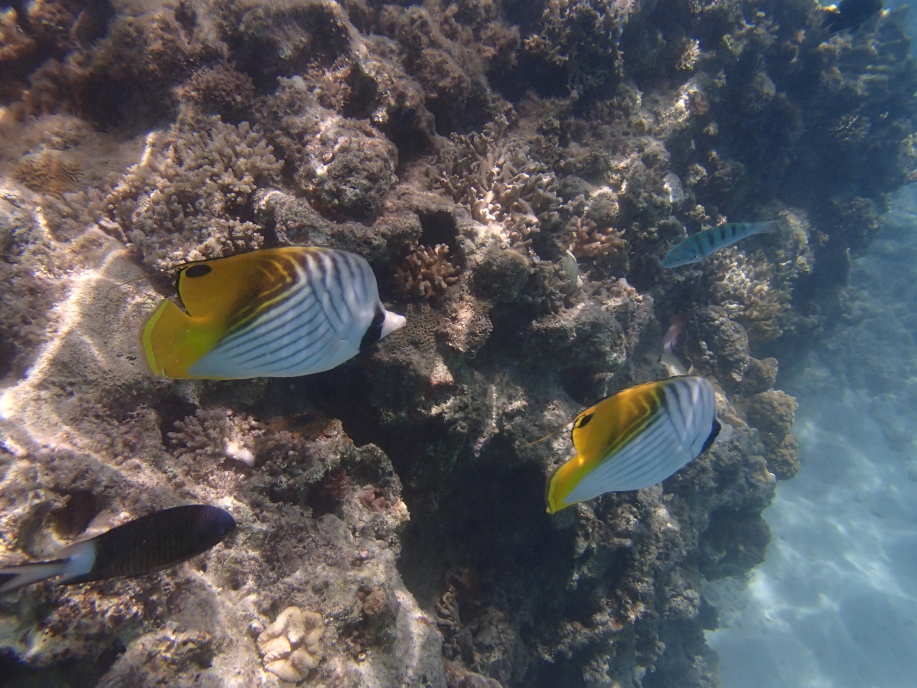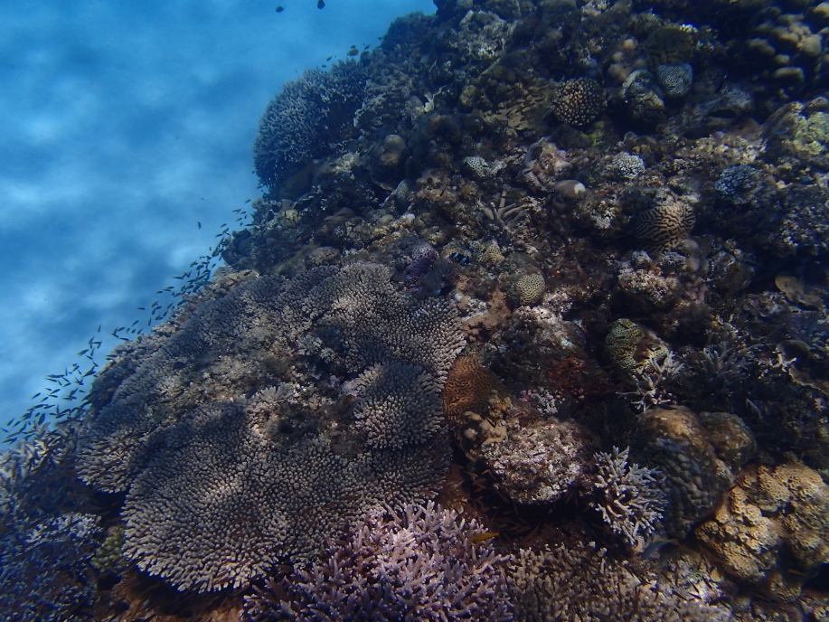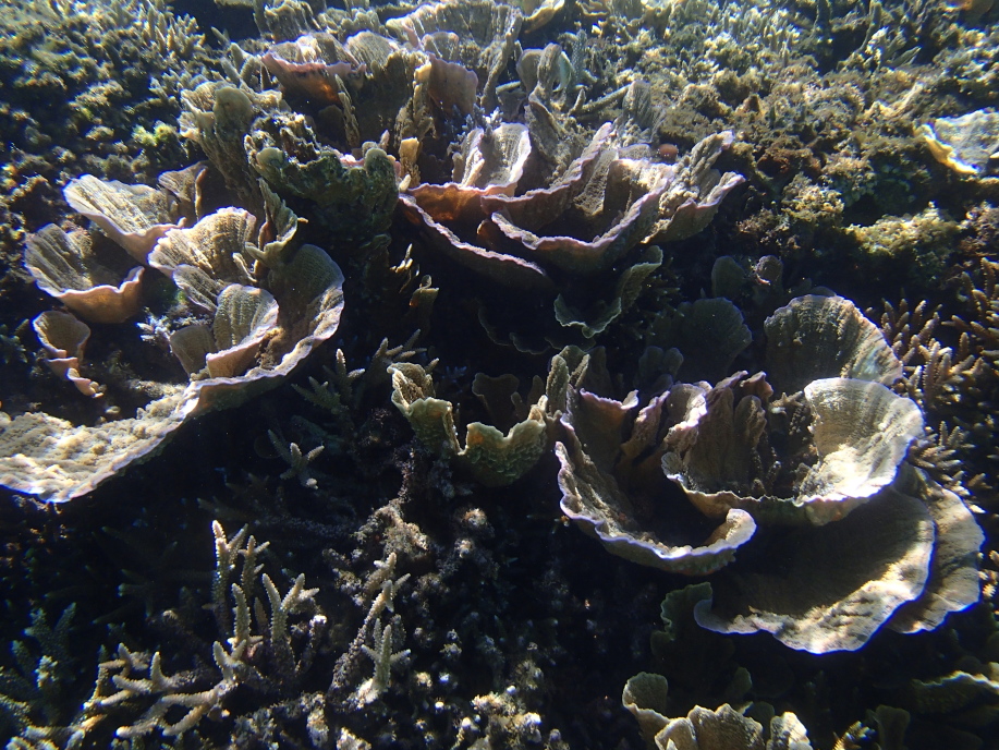 浜辺近くは緑色に水がどんよりとして少し気持ち悪かったんですが、しばらく沖へ泳ぐと枝珊瑚の群生が広がっていて凄く綺麗でした。