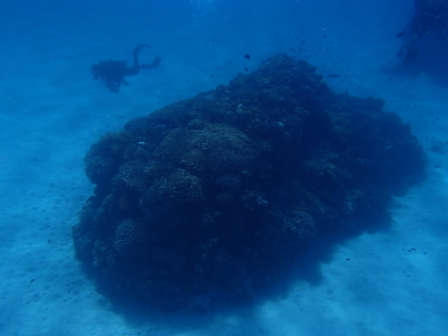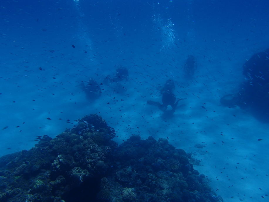 この下にある珊瑚の群生が綺麗な見どころだと思うんですが、ダイビングの人達は、皆でナマコを囲んで見てました。