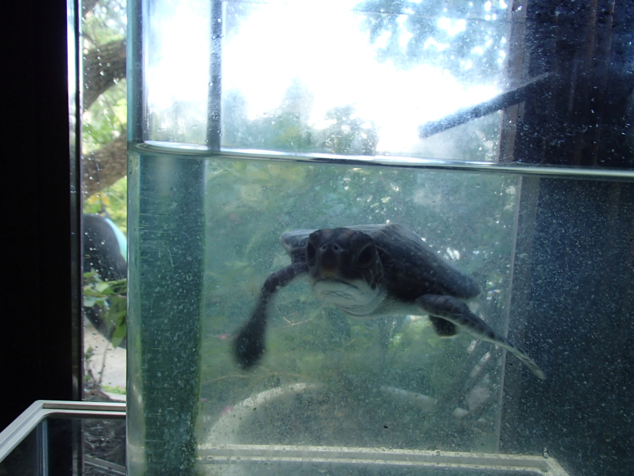 お父さんが、弱っているウミガメを何匹か保護してたそうなんですが、この1匹はまだ弱っているので、水槽に入れてたそうです。
