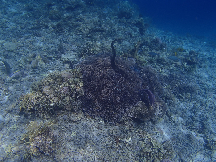 安慶名敷島で一番珊瑚の見どころの場所に行って見ると、何やら巨大なウツボかウミヘビか解らない生物が結構勢いよく動き回ってました。