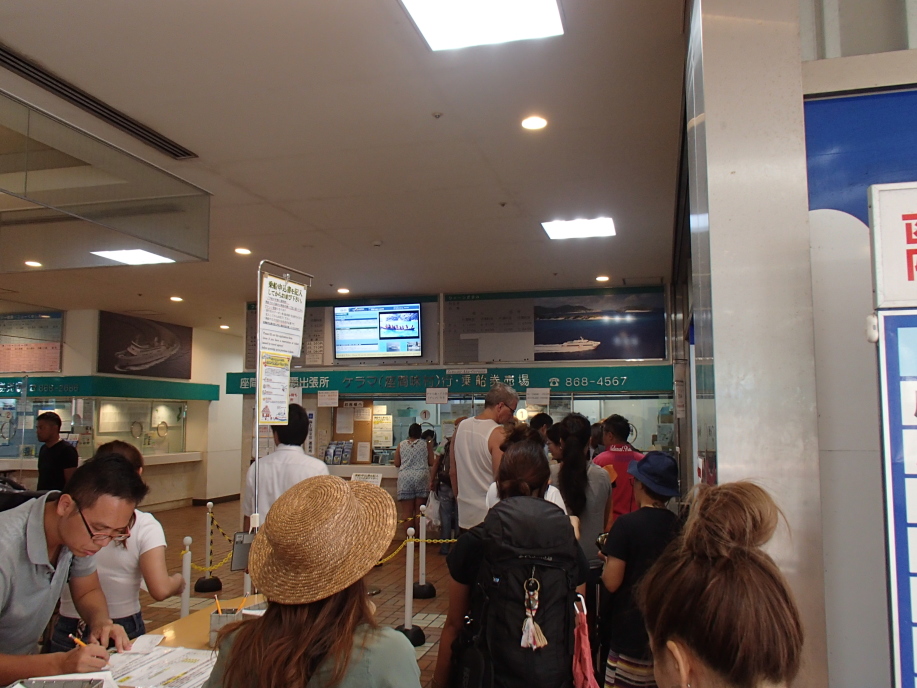 後で良ーく考えて見ると、たぶん外人さんが多かった為、ほとんどの人達はクレジットカードで支払いしてるんですが、チケット代の他に現金で「座間味村美ら島税」とやらを1人100円づつの支払いが必要なので、その支払いでいつまでも時間がかかっていたようなのです。