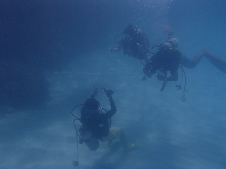 珊瑚の横辺りで、ダイビングツアーのお客さん達が記念撮影をやってました。