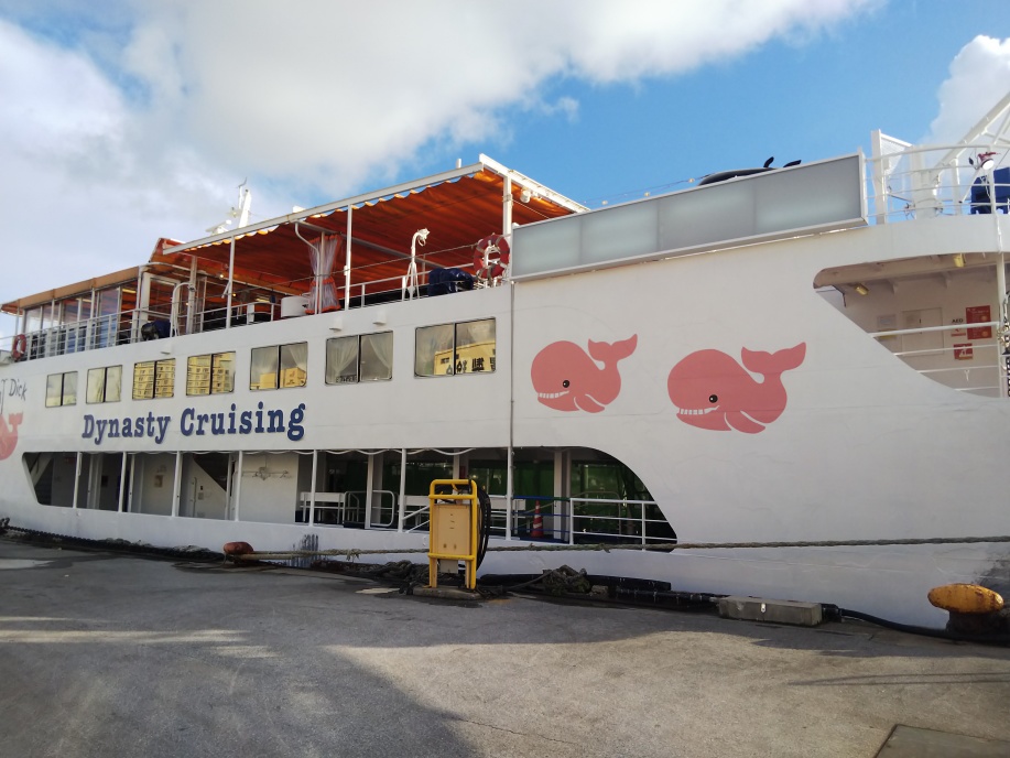 写真は、港に停泊している「香港」の外国船なんですが、こんな感じでメッセージを流してました。