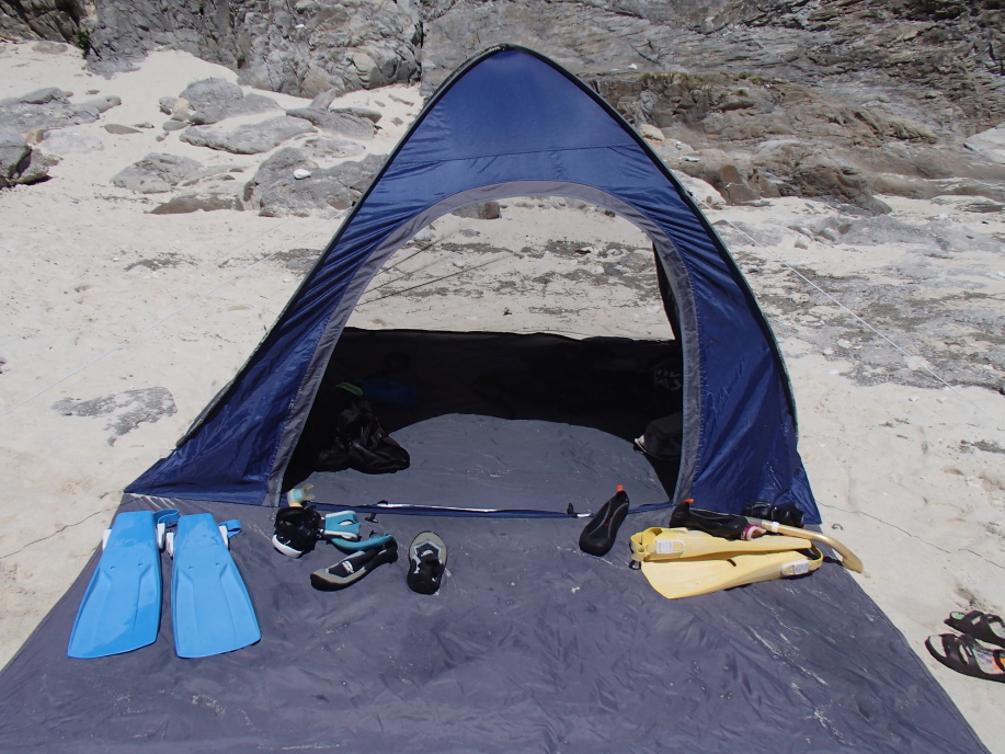 テントは張り終えたんですが、結構テント内に砂が入り込んでました。