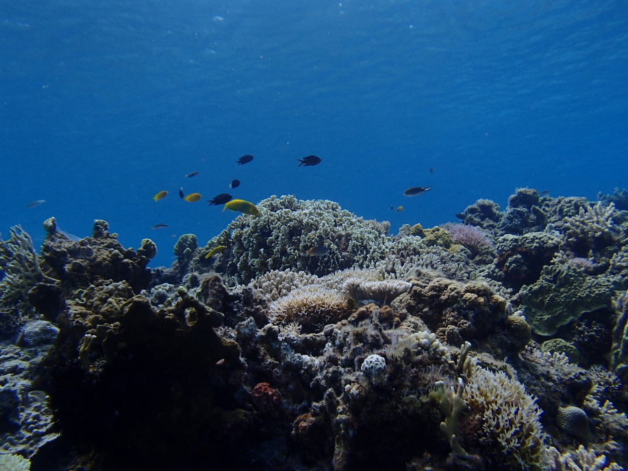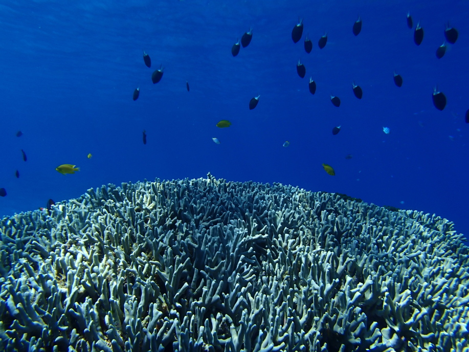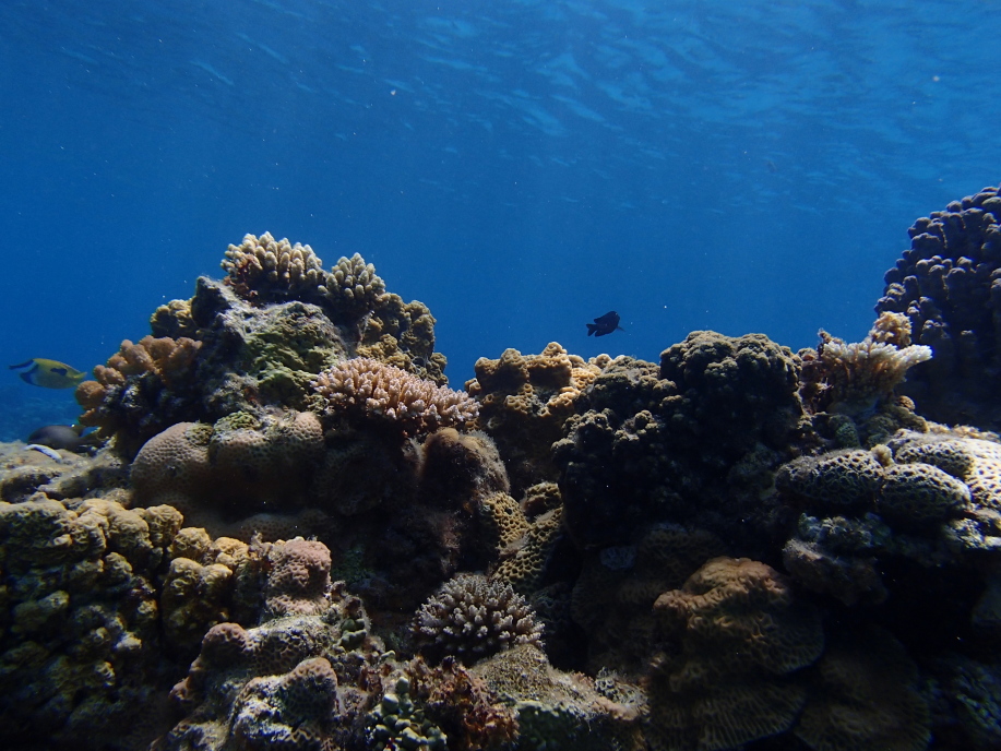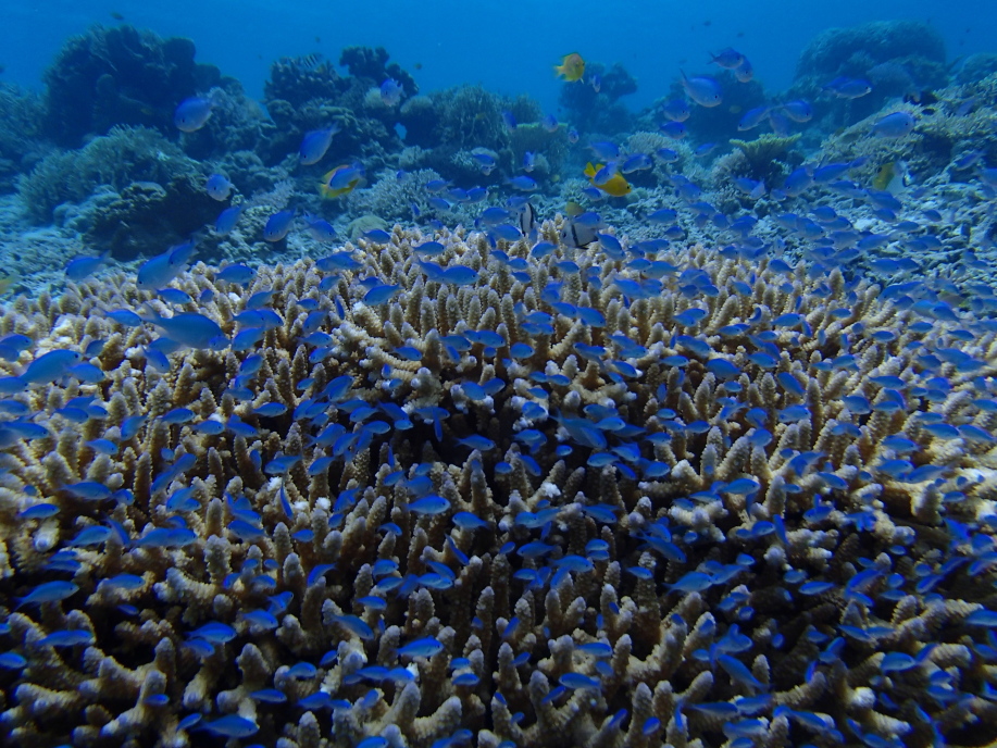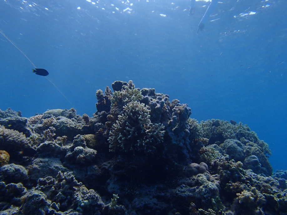 また潜って下の方から写真を撮ると、珊瑚に群がる魚達が一杯いて綺麗でした。