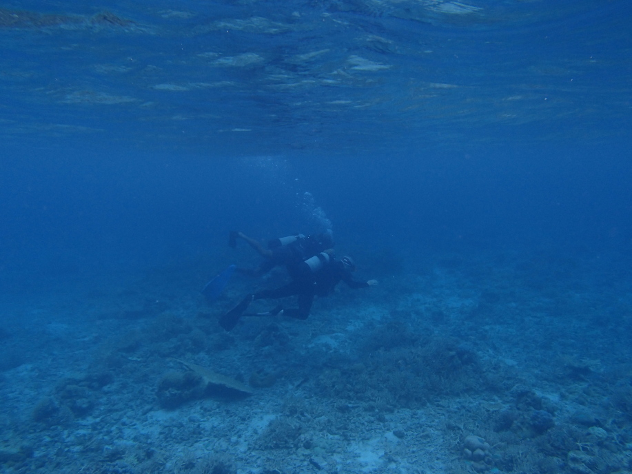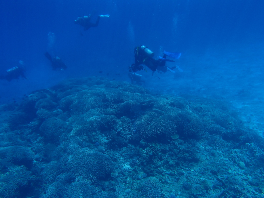 沖の方の緑色の珊瑚の群生の辺りへ行って見ると、丁度ダイバー達が来て泳いでました。
