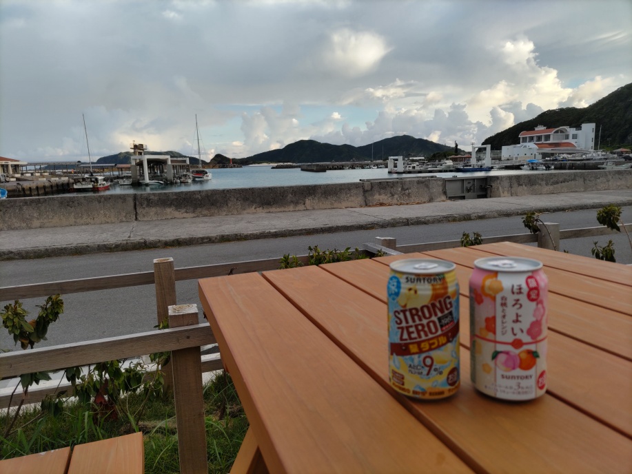 食後は、また昨日と同じ バス停横のベンチで酎ハイを買って来て頂きました。