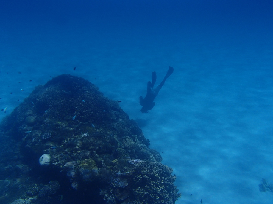 以前泳いだ時の記憶では、堤防近くに枝珊瑚の群生が居たような気がしたので、結構遠くまで泳いで見たんですが、全く見当たらず、たまに冷たい海流が流れて来たりするので海岸へ引き返す事にしました。