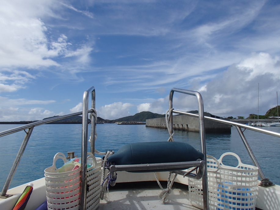バス停の待合室から港を見ていると、宮平さんの船が戻って来たので、約束の時間よりは早かったんですが、乗せてもらいました。