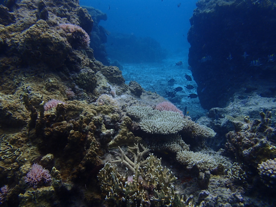 今回は島の周りを左方面へ、行ける所まで行って見ようと泳いで行くと、大きな岩が2つに割れていて、そこに珊瑚の群生や魚達が群がっていました。