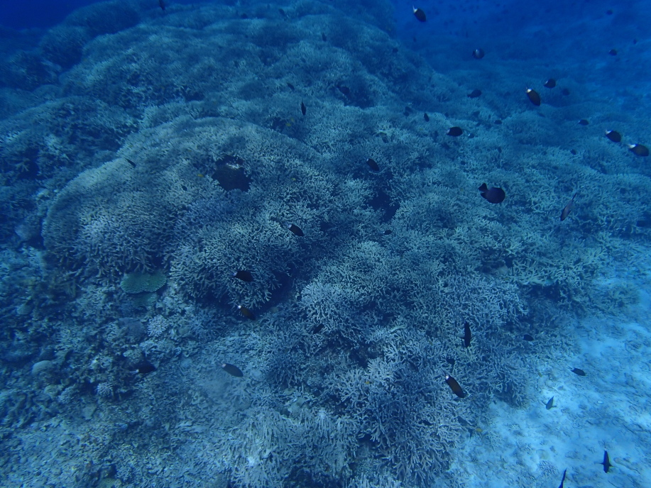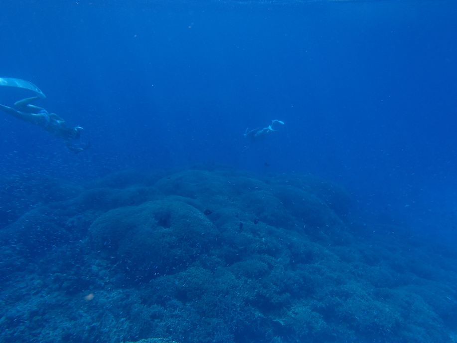 沖の緑色の珊瑚の群生辺りまで行くと、「GoPro」を持った娘達が潜ってました。