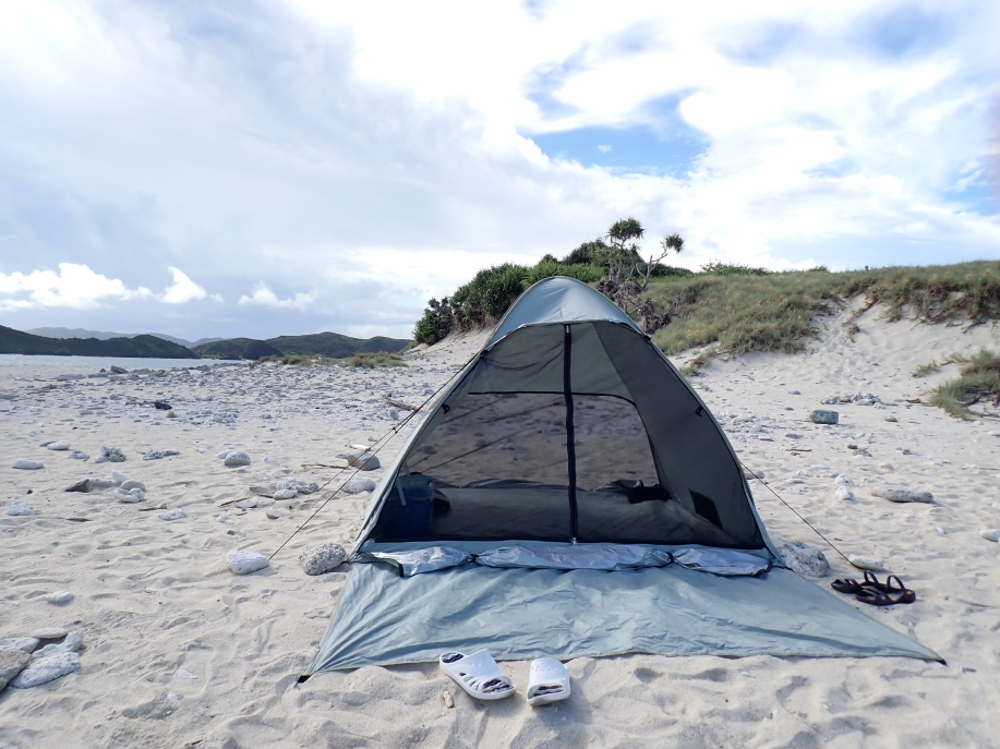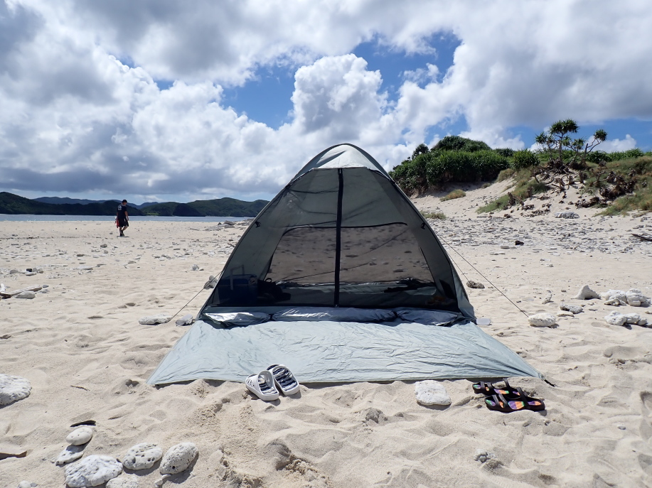 いつものように汗だくになりながらテントをペグで固定した後、うちの奥さんがその上にデッカイ石をのっけて設置完了しました。