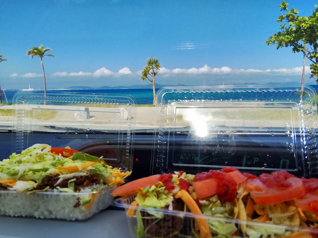 今日は天気が良く快晴のだったので「キングタコス与勝店」で「タコス」と「タコライス」を買って、うるま市の海中道路のパーキングでランチして来ました。
